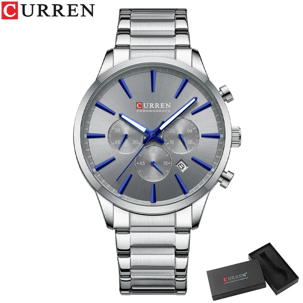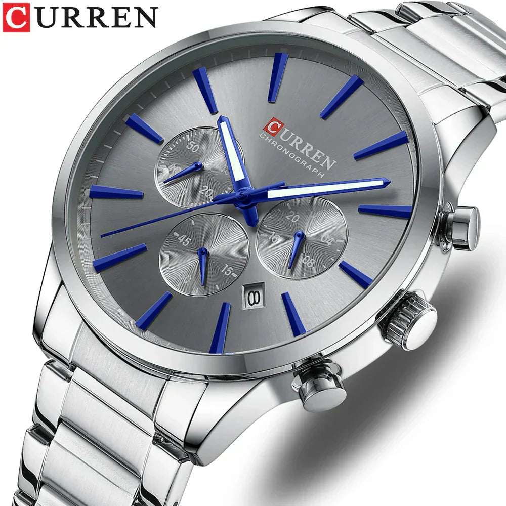 Elevate your style with this premium CURREN men's quartz watch. Designed with a sleek stainless steel strap, date display, and chronograph functionality. Ideal for business, casual, and sport use. Durable, waterproof, and a perfect gift choice.